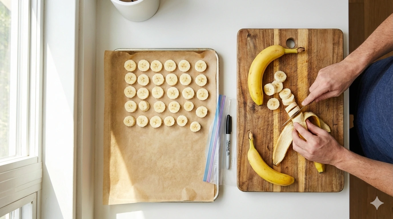 Peel and slice and flash freeze and bag and label. That is the whole system. Try it with the next bunch that starts going spotty on your counter and see how much easier things get.