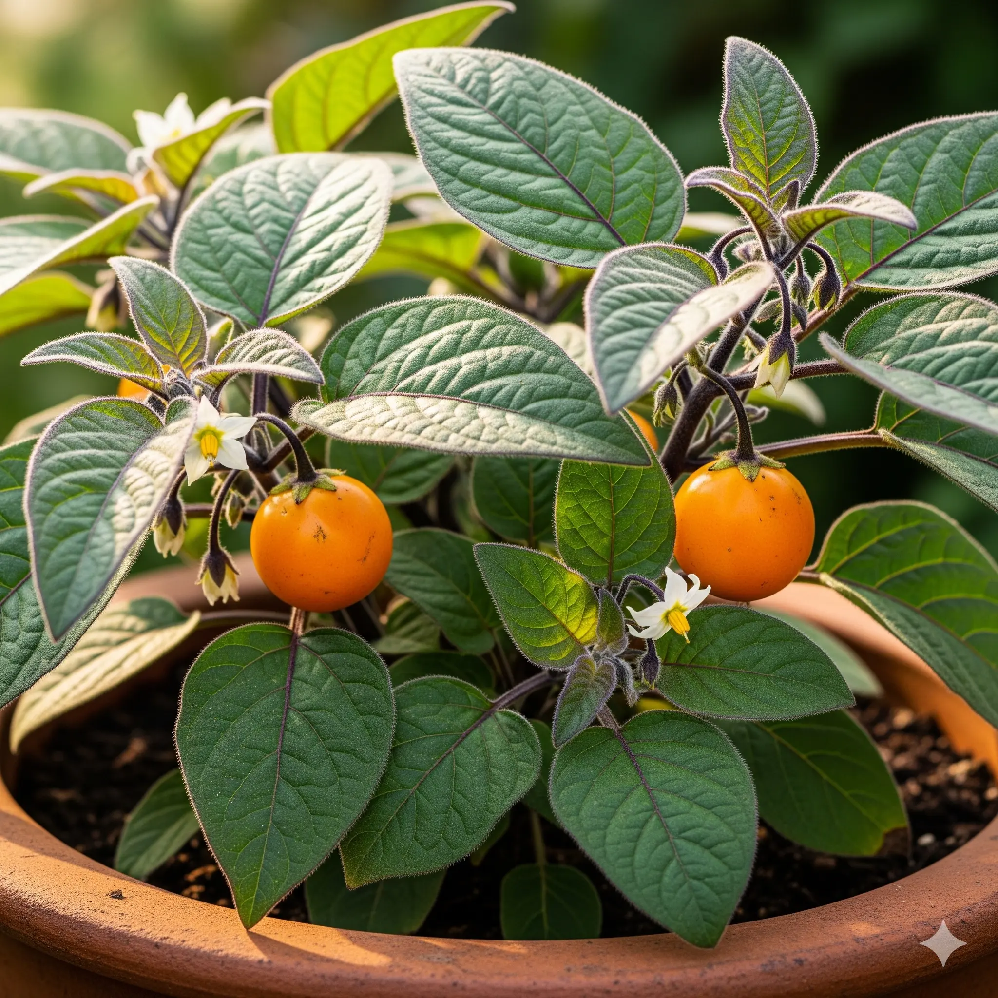 The leaves are the first thing most people notice. They are large, fuzzy, and often show purple hairs or veins. The flowers are usually white with yellow centers and may have purple tones in new growth. The fruit starts green and turns orange as it ripens. Before cleaning, the skin may have a brown fuzz.