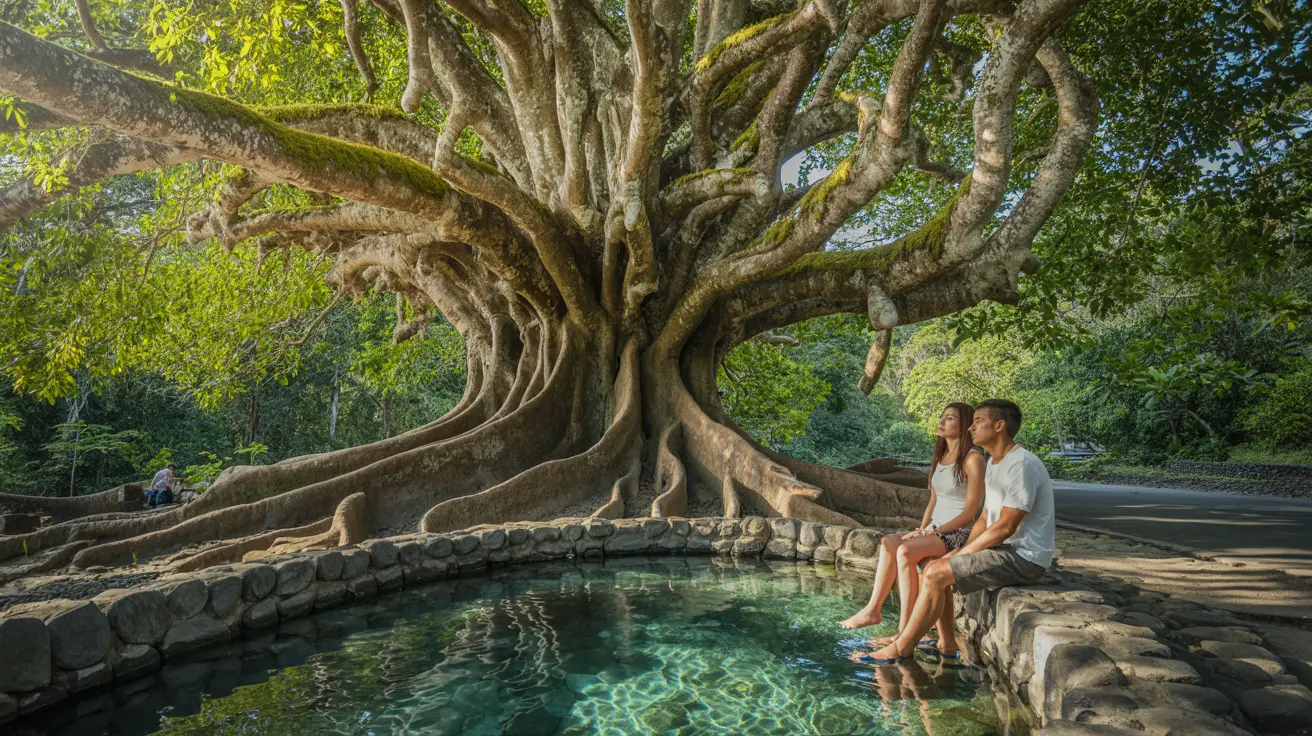 Spring water flows through a pool built near the tree. Visitors sit on the edge and dip their feet in. Fish gather around and nibble lightly, which feels ticklish for many people. The first minute often feels strange. After that, most people relax and laugh about it.